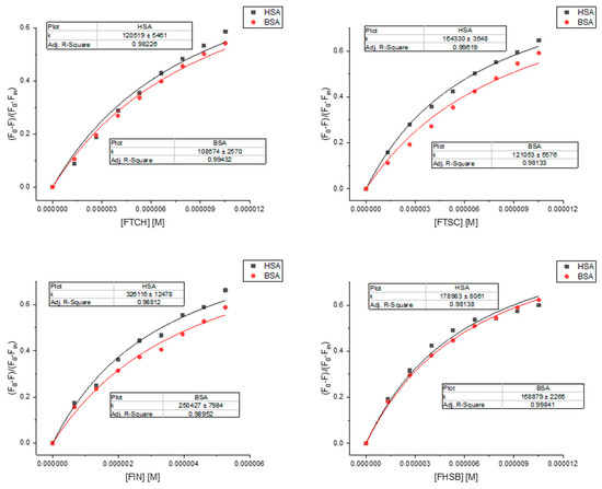 From Figure 7, it may be seen that the fluorescence spectra of studied albumins showed the broad maxima located at ~340 nm (HSA) and ~345 nm (BSA), and the addition of increasing concentrations of the ligands studied caused a reduction of the fluorescence intensity (fluorescence quenching). It suggests that the binding regions of the ligands studied are in the vicinity of the Trp residue. Upon increasing concentration of FTSC, a slight red-shift (~8 nm) of the fluorescence maxima of the albumins studied may be seen and this may indicate the increase in the polarity of the nearest neighborhood of tryptophan residue. The addition of FIN to HSA and BSA and FHSB to HSA caused a slight blue shift (~5 nm) of the fluorescence maximum indicating an increased hydrophobicity of the region surrounding the tryptophan site. The observed alterations of the fluorescence spectra may also indicate that the interactions studied may involve a perturbation of the native fold [32]. FTCH did not result in any shift of the emission maxima suggesting that there was no change in the immediate environment of the tryptophan residues.