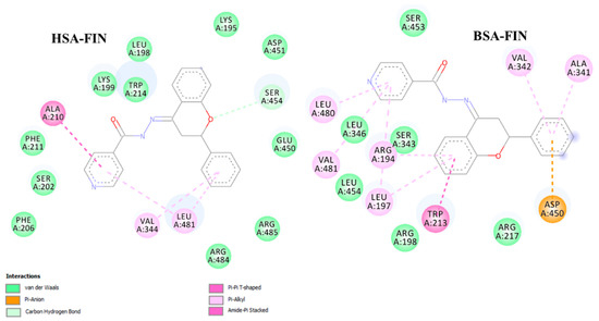 The binding constants that we found for the ligands studied to HSA and BSA are comparable with values for other known ligands (mostly ranged 104–106 M−1) [33]. The binding affinity to HSA and BSA is the highest for FIN. To get a deeper insight into the binding mechanism, docking simulations have been performed. We identified one high-affinity binding site, located at site 1 of subdomain IIA, close to TRP214 (HSA) and TRP213 (BSA) (Figure S5). Figure 9 illustrates the interaction of FIN with the nearby residues in the binding site of HSA and BSA (FTCH, FTSC, and FHSB are presented in Figure S6 in supplementary materials). The residues are involved in van der Waals, hydrogen bonding, and π-π interactions with the ligands studied. According to the obtained results, 4 hydrogen bonds: one in HSA-FTCH (with ASP451) and BSA-FTSC complex (with SER 343) and two hydrogen bonding in BSA-FTCH complex (with SER 343 and SER 453) may be noticed. However, the findings suggested that van der Waals interactions play a dominant role in the binding and the ligands are additionally stabilized by the π-π interactions. The results of calculations confirmed that the FIN has the highest affinity to serum albumins (Table 4) but the free energy change of binding (∆G) obtained for the lowest energy conformation from the docking simulations differ quantitatively from the experimentally obtained values. The reason for this discrepancy may be associated with the applied semiempirical energy function and/or with the neglect of solvent effects [34,35].