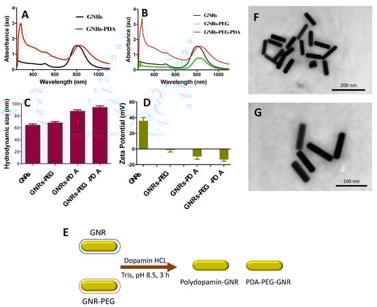 The shape, size, dispersion, and surface functionalization of GNRs-PDA were verified by Transmission Electron Microscope (TEM) imaging which revealed a rod-shape of the nanoparticles with a thin layer around them that suggests the successful surface coating of the nanorods (Figure 1F,G).