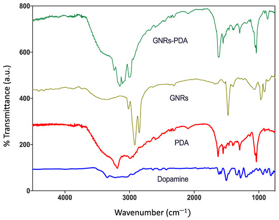 Fourier transform infrared (FTIR) analysis was performed to further confirm the successful conjugation of GNRs with PDA; the absorption band of PDA has the following distinct spectra; at ~3200 cm−1, which corresponds to the stretching vibrations of –OH and N–H groups in the PDA. Moreover, the sharp peaks at ~1629 cm−1 and ~1292 cm−1 are attributed to the C=O and C–O bonds, respectively. The peak at 1512 cm−1 is attributed for C=N and C=C. Upon conjugating GNRs with PDA, the FTIR spectrum of the conjugate, GNRs-PDA, demonstrated a similar spectrum to that of PDA (particularly the peaks related to the stretching vibrations –OH and N–H groups) and to that of the unconjugated GNR. However, the peaks were slightly broadened and underwent a low frequency due to conjugation with the surface of GNRs (Figure 2) [24].