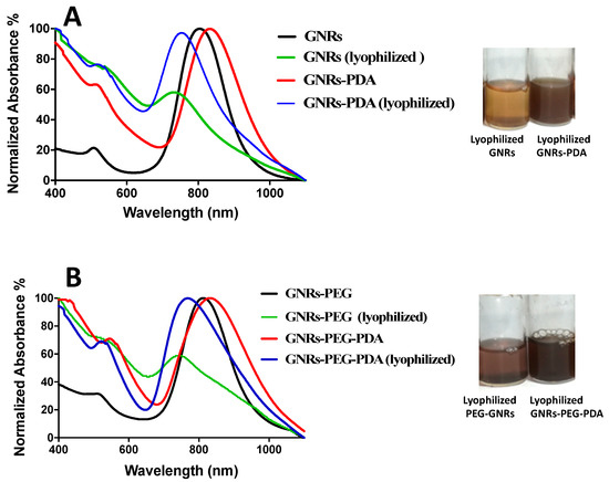 (A) UV-Vis absorption spectra of GNRs and GNRs-PDA before and after lyophilization. (B) UV-Vis absorption spectra of GNRs-PEG and GNRs-PEG-PDA before and after lyophilization. The photos indicate loss of the colloidal stable color and aggregation of the lyophilized GNRs and GNRs-PEG compared to lyophilized GNRs-PDA and GNRs-PEG-PDA, which have a superior colloidal stability.