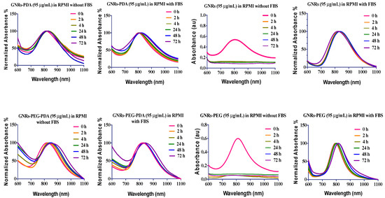 The longitudinal optical spectra of GNRs, GNRs-PEG, GNRs-PDA, GNRs-PEG-PDA dispersed in RPMI cell culture medium with and without addition of FBS after different incubation times.