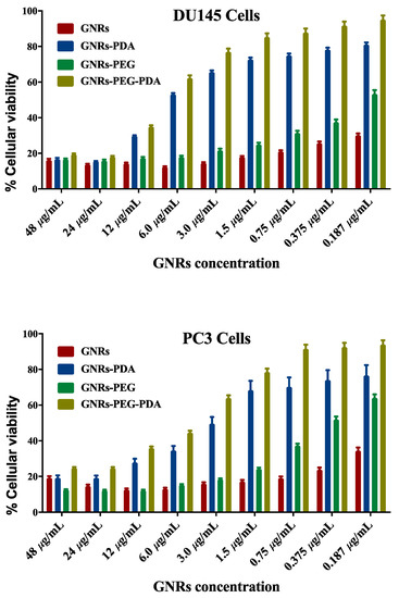 The cellular viability of both cell lines treated with GNRs and GNRs-PEG and their corresponding PDA-conjugates was investigated using MTT assays. As demonstrated in Figure 6, unconjugated GNRs exhibited substantial cytotoxicity (18–25% cellular viability) over a wide range of concentrations against both cell lines; however, PEGylation of GNRs has slightly reduced the cytotoxicity of the nanoparticles against DU-145 (20–50% cellular viability) and PC3 cell lines (20–60% cellular viability). Conjugating GNRs or GNRs-PEG with PDA reduced their cytotoxicity against both cell lines (20–90% cellular viability), over the low concentration range (3.0 μg/mL–0.185 μg/mL) after 72 h of incubation. However, PDA-conjugates preserved their cytotoxicity against both cell lines over the concentration range of 48 μg/mL to 12 μg/mL. PDA conjugated with PEGylated GNRs (GNRs-PEG-PDA) demonstrated slightly higher cellular viability than PDA conjugated to uncoated GNRs (GNRs-PDA) over the low concentration range. We propose that conjugating the nanoparticles with PDA may reduce their cellular uptake and consequently their direct cytotoxicity at low concentrations. PDA-coated nanoparticles’ biocompatibility and their utilization in various biomedical applications such as drug delivery, imaging, and photothermal therapy were demonstrated in several studies [42,43]. However, the crucial role of nanoparticles’ size and type of cell line exposed to treatment was reported in determining the cytotoxicity of conjugated nanoparticles [44]. Further, it was reported that the time of polymerization of DA to PDA onto the surface on GNPs greatly affected the cellular uptake extent of the PDA conjugates; those prepared by short polymerization time (1–6 h) were highly internalized into the cells compared to those prepared by using extended polymerization [20]. In our study, short polymerization time was used to prepare the PDA-conjugates.