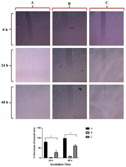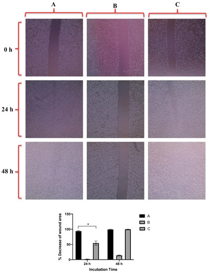 Up: In vitro cell migration of DU-145 cell line (control untreated cells) (A), upon treatment with positive control (quercetin) (B), and upon treatment with GNRs-PEG-PDA (C). Magnification power: 10×. Down: The percentage decrease in wound area was estimated using ImageJ. Data are represented as mean ± standard deviation (SD), n = 3. t-test was employed for the difference assessment; * p < 0.05.
