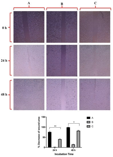 Up: In vitro cell migration of DU-145 cell line (control untreated cells) (A), upon treatment with positive control (quercetin) (B), and upon treatment with GNRs-PDA (C). Magnification power: 10×. Down: The percentage decrease in wound area was estimated using ImageJ. Data are represented as mean ± standard deviation (SD), n = 3. t-test was employed for the difference assessment; * p < 0.05, ** p < 0.01.