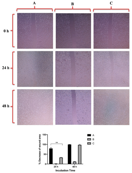 Up: In vitro cell migration of PC3 cell line (control untreated cells) (A), upon treatment with positive control (quercetin) (B), and upon treatment with GNRs-PEG-PDA (C). Magnification power: 10×. Down: The percentage decrease in wound area was estimated using ImageJ. Data are represented as mean ± standard deviation (SD), n = 3. t-test was employed for the difference assessment; ** p < 0.01.