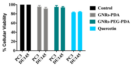 Before adhesion test was conducted, viability test of both cell lines (PC3 and DU-145) was done to select a non-toxic concentration of the treatments. Cell viability reduction up to 10% was considered acceptable. Cells were grown in RPMI medium with addition of 10% FBS to achieve 80% confluence prior to beginning of the test. A 96-well plate was layered with 50 μL of fibronectin and incubated at 37 °C overnight, the next day, excess fibronectin was drained, and the plate was blocked with 50 μL of 0.2% bovine serum albumin (BSA). Cells were collected with trypsin/EDTA and re-suspended in RPMI medium at approximately 125,000 cells/mL, and 100 μL of cell suspension were applied to each well pre-coated with fibronectin. The experiment was repeated in triplicates for GNRs-PDA (0.361 μg/mL), GNRs-PEG-PDA (0.741 μg/mL), and the positive control, quercetin (30 µM). The plate was then incubated for 30 min at 37 °C. After the incubation period, the wells were gently aspirated and washed three times with PBS, then; assay was performed to quantify the viable cells [60]. The experiment was performed in triplicate.