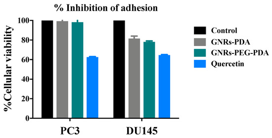 The percent inhibition of adhesion of PC3 and DU-145 cell lines upon exposure to GNRs-PDA, GNRs-PEG-PDA and quercetin are demonstrated in Figure 12. The results show that GNRs conjugated with PDA demonstrated moderate anti-adhesion potential against DU-145 cell line (18–22%) in comparison to control; however, no significant inhibition of adhesion was observed for the PC3 cell line.