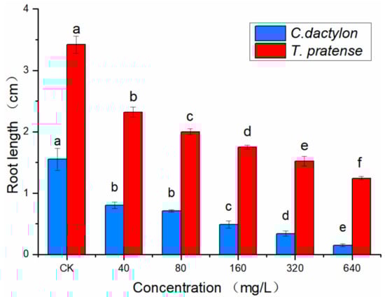 Effect of the ethanol extract of S. mukorossi pulp on the root growth of T. pratense and C. dactylon. The freeze–dried samples in water agar (0.5% agar) were set at 40, 80, 160, 320 and 640 mg/L. CK: untreated plants (control). Root length was recorded after four days of cultivation for T. pratense and seven days for C. dactylon. Values represent the means ± standard deviation (SD) from three replicates with ten seedlings. Different letters (a, b, c, d, e and f) indicate significant differences among treatments by ANOVA (p = 0.05).