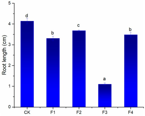 Effect of the fractions obtained from the ethanol extract of S. mukorossi pulp against the root growth of T. pratense at a concentration of 160 mg/L. CK: untreated plants (control). F1, F2, F3 and F4 represent 30, 50, 70 and 95% ethanol fraction, respectively. Values represent the means ± standard deviation (SD) from three replicates with ten seedlings. Different letters (a, b, c and d) indicate significant differences among treatments by ANOVA (p = 0.05).