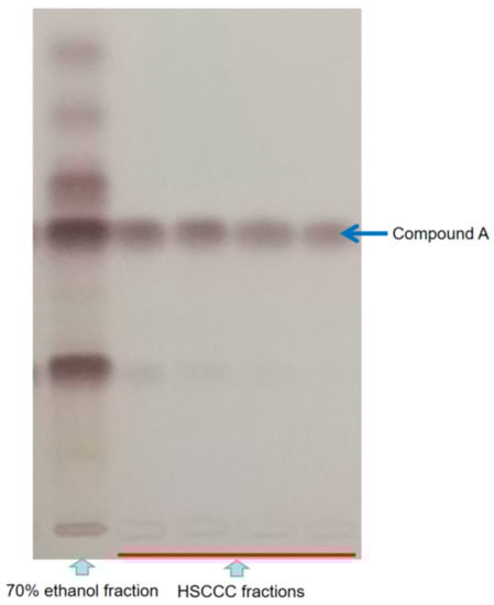 The two-phase solvent system composed of n-hexane-ethyl acetate–methanol–water (v/v/v/v, 1:4:1:4) was selected for HSCCC. The upper stationary phase was pumped into the coiled HSCCC column at 20 mL/min. Then, the apparatus was rotated at 900 rpm, and the lower phase was pumped into the column at 3 mL/min. After a hydrodynamic equilibrium was reached, about 10 mL sample solution containing 50 mg of 70% ethanol fraction was injected. The HSCCC fractions were collected using a fraction collector set at 5 mL for each tube. The running time was ~150 min for each sample. Different fractions were detected by thin layer chromatography (TLC). Thin-layer chromatography was carried out on the plates precoated with silica gel 60 F254 (Merck, Darmstadt, Hessen, Germany). Samples (2 μL) were applied to the plate using a Camag (Switzerland) Linomat V sample applicator. The plate was developed using n-butanol: water: acetic acid (84:14:7, v/v/v) as the developing solvent [33]. The developed plates were derivatized by immersing with ethanol: sulphuric acid (90:10, v/v) followed by heating at 110 °C for 10 min [34]. A pure fraction (named as compound A) was obtained.