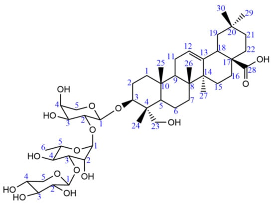 Comparison of the spectral data of compound A with the published literature [24,25], the chemical structure of compound A was determined as hederagenin 3-o-β-d-xylopyranosyl-(1→3)-α-l-rhamnopyranosyl-(1→2)-α-l-arabinopyranoside (Figure 4).