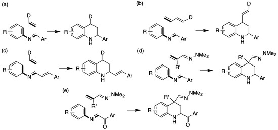 - Sridharan, V.; Perumal, P.T.; Avendaño, C.; Menéndez, J.C. The first aza Diels–Alder reaction involving an α,β-unsaturated hydrazone as the dienophile: Stereoselective synthesis of C-4 functionalized 1,2,3,4-tetrahydroquinolines containing a quaternary stereocenter. Org. Biomol. Chem. 2007, 5, 1351–1353. [Google Scholar] [CrossRef]