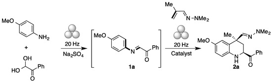 - Tan, Y.-J.; Zhang, Z.; Wang, F.-J.; Wu, H.-H.; Li, Q.-H. Mechanochemical milling promoted solvent-free imino Diels–Alder reaction catalyzed by FeCl3: Diastereoselective synthesis of cis-2,4-diphenyl-1,2,3,4-tetrahydroquinolines. RSC Adv. 2014, 4, 35635–35638. [Google Scholar] [CrossRef]