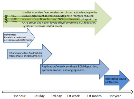 Studies on the treatment of thermal burns in rats conducted with the use of CAPE showed macroscopically 7, 21 and 70 days after the burn of a smaller wound surface and acceleration of contraction leading to the closure of the thermal damage to the skin in groups where CAPE was used compared to groups not supplied with the described compound. The positive effects of CAPE on the regeneration process of damaged skin in this study was also confirmed by biochemical analysis carried out 14 days after the burn. Analysis of myeloperoxidase activity showed a significant decrease in acute phase reagents. The nitric oxide determination showed a similar result. Tissue analysis 70 days after the burn also confirmed the long-term effect of CAPE, as it showed a reduced amount of myofibroblasts and CD68 positive macrophages in the CAPE group, and higher levels of hydroxyproline. These data show that the effect of CAPE on burn healing is still visible even after 70 days (CAPE administration stopped 14 days after the burn) [62]. Attention should be paid to some kind of modulation of proinflammatory mediator expression by CAPE used in wound healing. Studies in bedsores in mice have shown that the use of CAPE initially increased the expression of proinflammatory mediators (such as NOS2, TNF-α and NF-κB), infiltration of inflammatory cells, and oxidative damage (such as lipid peroxidation and peroxynitrite production). After 7 days, the expression of these parameters was reversed. This indicates the phenomenon of CAPE promoting early inflammatory response and associated oxidative stress as a short-term event, ultimately leading to accelerated healing of skin wounds and inhibition of inflammation and oxidative stress in the long term [19]. The process of treating damaged skin may hinder oxidative stress. CAPE has an antioxidant effect, thanks to which it can be widely used in the treatment of wounds of various origins, from minor skin abrasions to difficult-to-heal wounds such as burns, ulcers and pressure sores [63]. This is confirmed by studies on the effect of CAPE on the healing of skin wounds in rats, where a significant increase in the level of glutathione (GSH), which is an endogenous antioxidant and plays a key role in cellular defense in oxidative stress, has been shown in damaged CAPE-supplied tissues [63]. In the study, it was observed that GSH showed a progressive increase in the CAPE group, with significant differences on days 7 and 14, compared to the control group. CAPE, through its own antioxidant properties, can prevent GSH depletion. There was also a significant decrease in malondialdehyde (MDA) and superoxide dismutase activity in the CAPE group compared to the control group. Reactive oxygen species (ROS) are produced in response to skin damage and may cause cell damage by membrane lipid peroxidation, protein cross-linking and DNA breakdown. The study found a significant decrease in MDA levels in the CAPE group, especially on days 7 and 14 [63]. The multidirectional effect of CAPE in the form of free radical scavenging, anti-inflammatory and antimicrobial makes it an ideal candidate for the treatment of difficult-to-heal wounds of various origins.