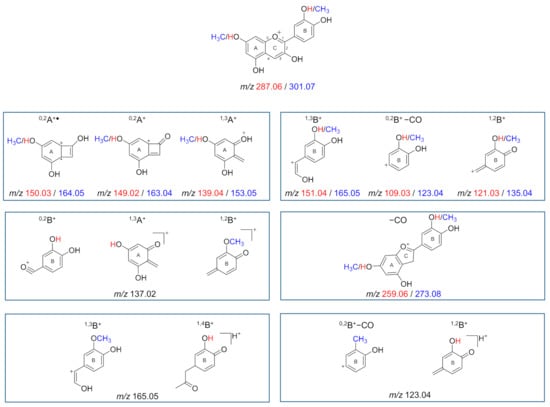 - Hvattum, E.; Ekeberg, D. Study of the collision-induced radical cleavage of flavonoid glycosides using negative electrospray ionization tandem quadrupole mass spectrometry. J. Mass Spectrom. 2003, 38, 43–49. [Google Scholar] [CrossRef] [PubMed]