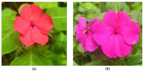 Flower specimens of the Impatiens walleriana studied. (a): orange petals and (b): pink petals (authorship by the author).