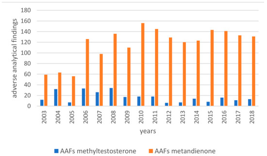 Adverse analytical findings of methyltestosterone and metandienone between 2003 and 2018, according to [4].