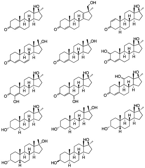 - Macdonald, B.S.; Sykes, P.J.; Adhikary, P.M.; Harkness, R.A. The identification of 17α-hydroxy-17-methyl-1,4-androstadien-3-one as a metabolite of the anabolic steroid drug 17β-hydroxy-17-methyl-1,4-androstadien-3-one in man. Steroids 1971, 18, 753–766. [Google Scholar] [CrossRef]