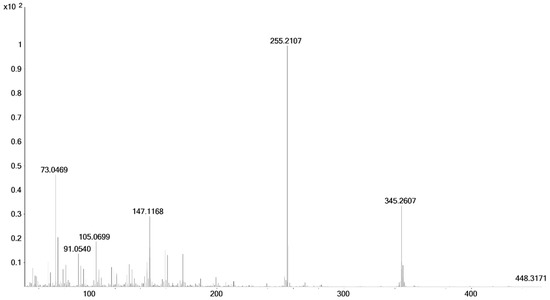 As is common in diastereomers, all yielded very similar mass spectra. As an example, the spectrum of 17α-hydroxymethyl-17β-methyl-18-nor-5β-androst-13-en-3α-ol (8) is displayed in Figure 5. Using electron ionization at low energy (15 eV, low energy electron ionization, LEI) the molecular ion, which was literally invisible at regular ionization energy (viz. 70 eV), was detected at the accurate mass m/z 448.3162. The retention time of the bis-trimethylsilyl (TMS) derivatives of the diastereomers are given in Table 1. Further structure confirmation was achieved by 1D and 2D-NMR analysis. Assignments are provided in Table 2.