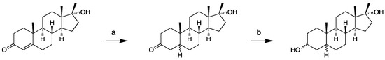 - Nishimura, S.; Shimahara, M.; Shiota, M. Stereochemistry of the Palladium-Catalyzed Hydrogenation of 3-Oxo-4-ene Steroids1. J. Org. Chem. 1966, 31, 2394–2395. [Google Scholar] [CrossRef]
