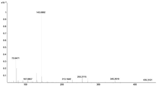 Mass spectrum (GC-EI-QTOF-MS, 70 eV) of 17α-hydroxymethyl-17β-methyl-18-nor-5β-androst-13-en-3α-ol (8), bis- trimethylsilyl) (TMS (x-axis: m/z; y-axis: relative abundance).