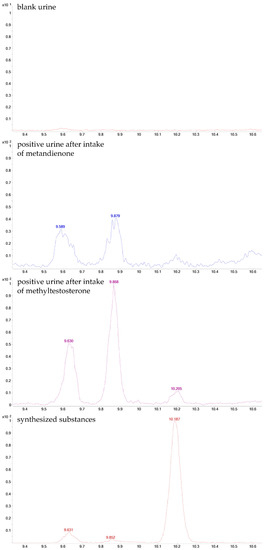 The 3α,5β-epi-tetrahydromethyltestosterone was identified as the first peak in positive urine samples of metandienone and methyltestosterone at 9.56 min (Figure 8).