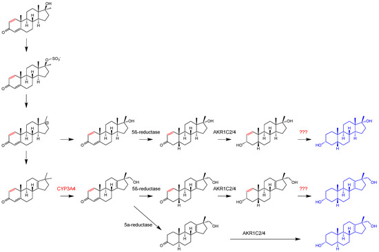 Proposed metabolism of methyltestosterone (black, 18) and metandienone (red, 12) to the found metabolites 17α-hydroxymethyl-17β-methyl-18-nor-5β-androst-13-en-3α-ol (8), 17α-hydroxymethyl-17β-methyl-18-nor-5α-androst-13-en-3α-ol (8a), and 17β-methyl-5β-androstane-3α,17α-diol (11) except last step of metandienone. The question marks represent reactions whose enzymes have not been elucidated yet.
