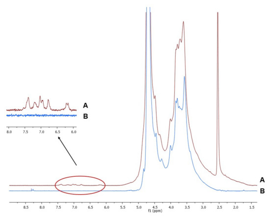 The 1H-NMR spectra of Alg and AlgCF are reported in Figure 2. Signals in the range of 4.2–5.1 ppm were assigned to the Alg and AlgCF anomeric protons of β-d-mannuronic acid and α-l-guluronic acid repeating units, and to the methine protons adjacent to the carboxyl groups, the resonance of the remaining protons of sugar rings fall in between 3.2 and 4.1 ppm [45,46]. In the AlgCF spectrum, new signals not recorded in the spectrum of native Alg and assigned to CF residues were detected and considered to be experimental evidence for the effective formation of the conjugate, namely the olefinic protons at around 6.2 (α) and 7.4 (β) ppm and the aromatic protons in the range of 6.6–7.3 ppm [47].