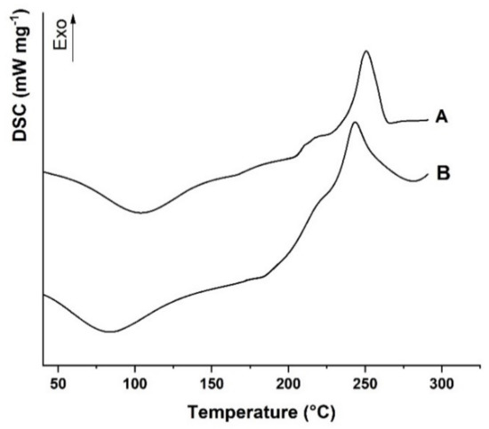 Alg showed the typical DSC curve of polysaccharide materials with hydroxyl and carboxyl functionalities in the repeating units, with a first transition at 95 °C, assigned to the evaporation of moisture from the polymer [48], and a broad exothermic at 243 °C, expressing the formation of CO2, CH4, and H2O from polysaccharide chains due to decomposition at a higher temperature [49]. The decomposition involves different kinds of chemical reactions, including depolymerization, elimination of oxygen-rich functionalities in the side chains, chain scissions, recombination, and cross-linking, which can be accelerated in the presence of radical species [50].
