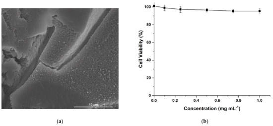 HACG was characterized by a rough and porous surface, as per morphological investigation (Figure 4a), while human fibroblast lung cells (MRC-5) viability values higher than 94.0% ± 2.5 upon incubation of HACG (0.1 to 1.0 mg mL−1 concentration range, Figure 4b), confirmed its biocompatibility. These cells, indeed, are widely recognized as an in vitro model to check the toxicity of different kinds of biologically oriented materials, due to their specific metabolic features and high sensibility to almost any types of chemicals [52].