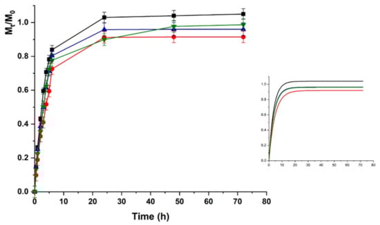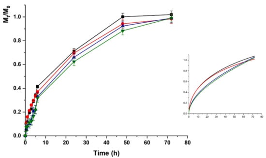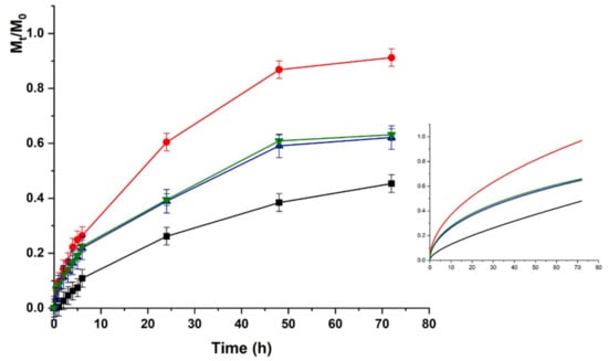 LZM release profiles from HAC at pH 7.4 and (■) 0; (●) 12; (▼) 24; and (▲) 48 V. Inset: Fitting curve by Equation (3).