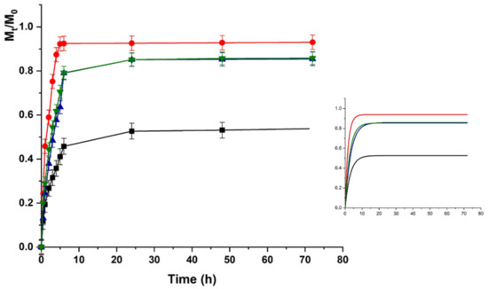 Lysozime (LZM) release profiles from HAC at pH 5.5 and (■) 0; (●) 12; (▼) 24; and (▲) 48 V. Inset: Fitting curve by Equation (5).