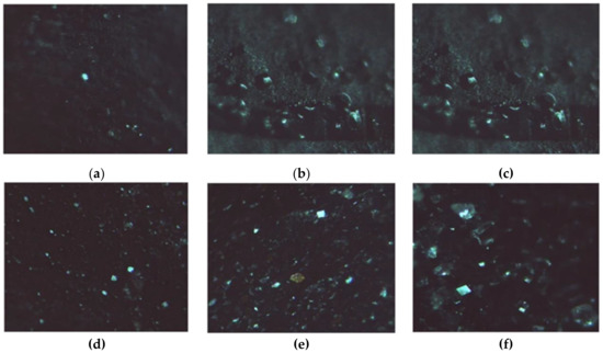 LZM crystals. (a–c) Observed on HAG; (d–f) Observed on HACG, after (a,d) 24, (b,e) 48, and (c,f) 72 h in the presence of H2O2.