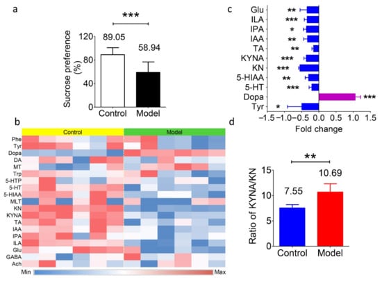 Levels of transmitters and metabolites in fecal samples of the depression model and normal control Sprague-Dawley rats. (a) Percentage of sucrose preference in the normal control group (89.05%) and depression model group (58.94%). *** p < 0.001. (b) Heatmap of the nineteen transmitters and metabolites in fecal samples from both groups. Blue represents a lower level, and red represents a higher level. (c) The fold change of the substance levels in the model group versus the control group with significance. * p < 0.05, ** p < 0.01, *** p < 0.001. (d) Value of the KYNA/KN ratio in the model group (10.69) and the control group (7.55). * p < 0.01. Data in a, c, and d are shown as the means ± SD and were analyzed by two-tailed Student’s t test.