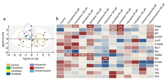 Several guideline suggested first-line drugs that treat NVS diseases have been screened for their regulatory potential of gut microbiota [51]. Sertraline and fluoxetine are selective serotonin reuptake inhibitors (SSRIs), and imipramine is a nerve terminal reuptake inhibitor; the indications of these three drugs are depression in adults. Levodopa is a typical anti-Parkinson’s disease drug, using direct transmitter supplementation. Clozapine is a nonclassical neuroblocker for schizophrenia, and chlorpromazine is an antagonist of central dopamine receptors in alleviating schizophrenia symptoms. In Figure 4a, all the samples are within the 95% confidence level, and among them, sertraline, imipramine, and chlorpromazine exhibited preferable regulatory potential for neurotransmitters and metabolites. The transmitters or metabolites that showed variations in level are shown in the heatmap (Figure 4b). Both groups of the SSRIs showed a significant increase in the levels of GABA (p < 0.001) and Dopa (p < 0.01 and p < 0.001), an increase in DA plus KN, and a decrease in Glu in the gut microbiota. High-dose imipramine (100 μM) showed an obvious downregulation of the KYNA/KN ratio (p < 0.001). Levodopa did not have an obvious effect on the metabolites in the Trp or Glu pathways, and similar results were observed in the clozapine groups. In addition, the high dose of chlorpromazine induced the production of DA (p < 0.05) and KN (p < 0.01), and simultaneously decreased the Glu level (p < 0.05) in the gut microbiota.