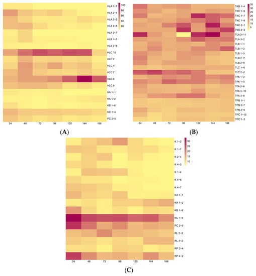 We observed different rates and kinetics of IRC production. The highest IRC yield (108.26 μg∙mL−1) was recorded for the endophytic strain (HLC 8) isolated from the leaves of T. aestivum L. cv. Hondia after 144 h (Figure 1). In contrast, the lowest rates of IRC synthesis (9.52–16.69 µg∙mL−1) was noted for isolates (K 4-3 and K 1-2) originating from the roots of T. spelta L. cv. Rokosz. The amount of IRCs released by the endophytes to the medium varied depending on the time of culturing. It was found that 10 strains were able to secrete IRCs continuously in their culture medium in shaking culture for up to 168 h. These strains were marked with the following codes: HLC 10, HLC 2, HLC 4, HLC 7, HLC 8, HLC 9, HLA 2-2, HLA 2-5, RP 4-2, and TPA 1-2 (Table A1, Figure 1). In contrast, selective production of IRCs by the tested strains was also evidenced by confirmation of the presence of IRCs in only one-day cultivation treatment. This trend was verified in strains with the following codes: TPC 1-2, TPC 1-12, RL 4-2, K 2-4, and K 1-7 (Figure 1C).