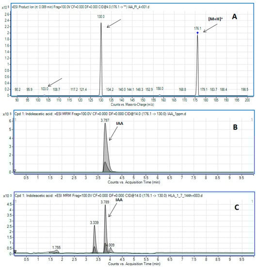 The LC-MS/MS method was applied to confirm the presence of IAA among IRCs in the post-culture medium. In the chromatographic conditions applied, in the positive ion spectrum, free IAA shows an ion at m/z 176.1 corresponding to the protonated molecule ([M + H]+) [18]. Its fragmentation results in quinolinium ions at m/z 130.0 and much less intensive ions at m/z 103.0 (Figure 2A). Based on these observations, the transitions 176.1 > 130.0 (quantifier) and 176.1 > 103.0 (qualifier) were monitored in the multiple reaction monitoring (MRM) mode (Figure 2B,C) to determine IAA generated by the studied bacterial species.