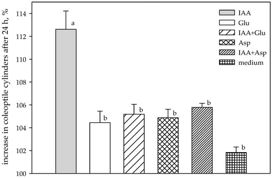 Growth of wheat coleoptile segments treated with exogenous IAA and its conjugates. IAA = 30 µg∙mL−1; IAA + Glu = 30 μg∙mL−1; IAA + Asp = 30 µg∙mL−1; Glu = 30 µg∙mL−1; Asp = 30 µg∙mL−1; medium (control) = medium alone. Data are means of five replicates. Error bar at each point indicates ± SE. Different letters above each bar indicate significant differences (p < 0.001).