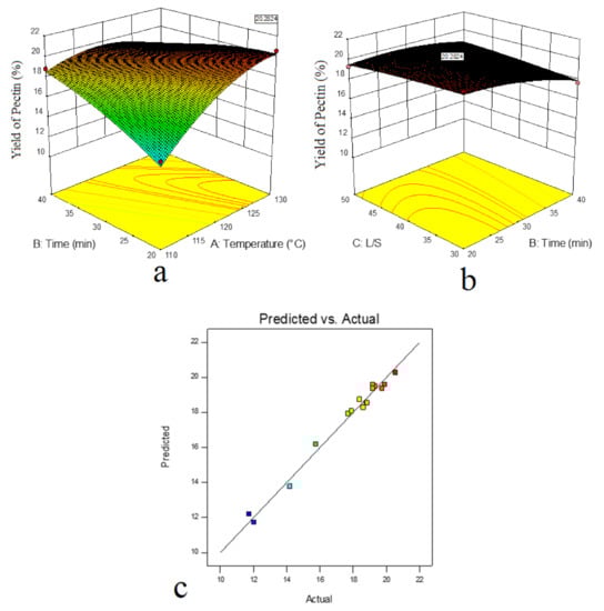 The steepness of response surface according to extraction time (B) and L/S ratio (C) showed that extraction time and L/S ratio had a great influence with the change of extraction conditions (Figure 1b). Furthermore, the ellipse shape in the contour plot (Figure 1b) indicated the interaction effect between time and L/S ratio. The maximum yield of pectin was achieved in the center of the ellipse shape (longer times and lower L/S ratios) and decreased from center to boundary (shorter times and higher L/S ratios). The reason for the reduction of pectin yield with increasing the L/S ratio was that more solvent raised the solving volume; however, too much solvent led to the additional load for further treatment [22]. Figure 1c depicted the correlation between actual and predicted yield values. Both temperature and time showed positive quadratic effects (p < 0.05), while the L/S ratio showed a negative linear impress on the pectin yield (p < 0.05).