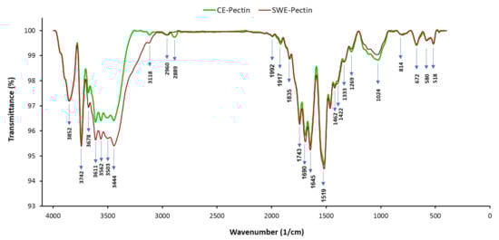 The pectin identity and the effect of SW on the structural properties of extracted pectin were determined through infrared spectra of pectin with a KBr (alkali halogenide)-pellet technique using a Tensor 27 FTIR spectrometer (BrukerOptik, Gmbh, Berlin, Germany) at the range of 400–4000 cm−1. Wave number accuracy was 0.1 cm−1. All spectra were post-processed using OPUS software (Version 6.5, Bruker Optik, Berlin, Germany).