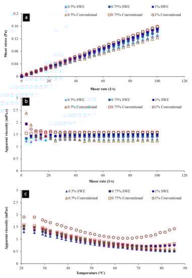 The pectin sample obtained under optimal extraction condition was used for rheological tests. Shear stress and apparent viscosity of pectin extracted by SWE and conventional heating as a function of shear rate at concentrations of 0.5%, 0.75%, and 1%, w/w were shown in Figure 3. Figure 3a demonstrates the flow behavior of pectin solutions under steady shear conditions, which were characterized by a plot of stress versus shear rate. Almost a linear trend of shear stress as function of shear rate was seen for both SWE and conventionally extracted pectins, indicating nearly Newtonian behavior, since very dilute pectin solutions (of very low viscosity) appear to have the properties of Newtonian fluids. For both pectin types, a 1% solution exhibited higher values of stress than those of lower concentration solutions. The effect of solution concentration on apparent viscosity at different shear rates is shown in Figure 3b. Higher apparent viscosity values (Figure 3b) were observed for both pectin types at higher concentration (1% w/w). In all solutions, viscosity was decreased with increasing the shear rate, showing a shear-thinning behavior. These observations were in agreement with the results found for pectin extracted from sugar beet pulp in other studies [16,33], and it is characteristic of random coil polysaccharides [34].