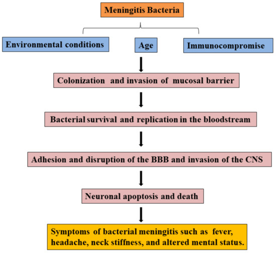 Bacterial meningitis (BM) is the major cause of the central nervous system (CNS) infectious diseases among infants, adults, and older people, which usually induce high mortality and 50% of the survivors left permanent neurological sequelae [1,2]. Bacterial meningitis can affect anyone of any age, including neonatal bacterial meningitis, adult bacterial meningitis, and senile bacterial meningitis. Simultaneously, environmental conditions and immunocompromised people are susceptible to bacterial meningitis. The pathogenesis of bacterial meningitis is as follows: firstly, meningitis bacteria can colonize the skin or different mucosal surfaces of healthy persons, then disseminated by blood and penetrated host barrier, finally resulting in systemic infection and neuronal injury [3,4]. The pathogenesis of BM mainly includes high-level bacteremia in the bloodstream, the destruction of the BBB integrity, and cerebrospinal fluid (CSF) pleocytosis, overwhelming inflammatory response in the CNS [3,5,6], which results in serious damage to the nervous system and even death. Up to now, lots of reports have shown the molecular mechanisms of BM resulting from bacterial ligand–receptor interactions, degradation of tight junction proteins, high matrix metalloproteinases (MMPs) expression, oxidative stress, and associated signaling pathways. Although antibiotics and vaccines have been able to significantly reduce meningitis mortality for clearing bacteria, the emergence of drug-resistance bacteria and the limitations of vaccine serotype make BM still cause high morbidity and seriously neurological damage sequelae. Hence, new therapies of prevention or treatment need to improve the BM.