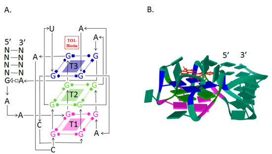 The analysis of the crystal structure of the Mango–TO1-biotin complex showed that the core of this aptamer, consisting of 23 nucleotides, is a three-level G-quadruplex (T1, T2, T3). TO1-biotin is adjacent to one of the nearly planar T3 faces of the G-quadruplex, and each of the three heterocycles of the fluorophore carries out stacking interactions with the nitrogenous bases of the RNA loop [82] (Figure 1).