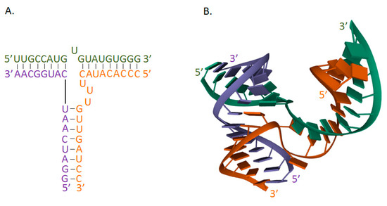 Structure of phi29 prohead RNA (pRNA) 3-way junction core. (A) The secondary structure of the pRNA. (B) The tertiary structure of the pRNA (PDB ID: 4KZ2) [137].