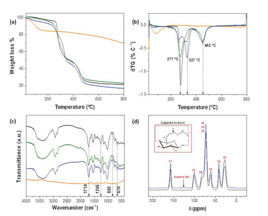 Thermograms (a) and corresponding dTGs (b) for PCD (black line), PCD/AC5% (green line), PCD/AC10% (blue line) and AC (orange line). FTIR and 13C CPMAS solid state NMR spectra are shown in (c,d), respectively.