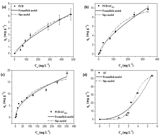 Sorption isotherms of IMD onto: (a) PCD, (b) PCD/AC5%, (c) PCD/AC10% and (d) AC, at 25 °C.