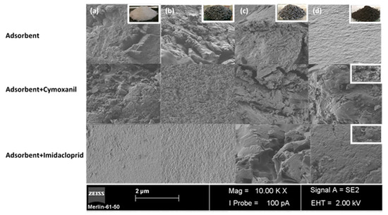 The interaction between IMD and CYM and the four different adsorbents was complementary evaluated by scanning electron microscopy (Figure 6).