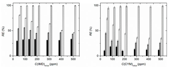 The micrographs show an irregular and amorphous surface for PCD and PCD/AC5% (Figure 6a,b—top row) and become smoother by increasing the amount of AC. After 24h in contact with the aqueous solution of CYM and IMD, respectively, significant morphological alterations have been observed. Thus, the surface morphology of PCD becomes significantly more featureless in the presence of IMD and a similar behavior occurs for PCD/AC5%, showing that for this gel composite, the cyclodextrin effect is predominant. On the other hand, an opposite effect is observed for PCD/AC10% and AC; i.e., the sorption of CYM by PCD/AC10% (c)-middle row) leads to a highly jagged surface, which is enhanced in the presence of IMD. In the case of AC the effect of both pesticides on the adsorbent surface morphology do not follow the same trend, although they are different when compared with the pristine adsorbent. The former evidence is in close agreement with the fact that IMD interacts more strongly with the gel than the CYM thus producing a more significant surface modification; the latter might be related with the high performance of the activated carbon for the sorption of both pesticides reaching a removal efficiency higher than 98% (Figure 7) and a maximum amount of sorbed CYM and IMD of 53.4(±0.7) and 49.5(±0.3) mg g−1 (Figure S2) respectively. The analysis of Figure 7 and Figure S2 deserves further comments. The performance of PCD is the poorest of all adsorbents (tested with RE lower than 35% and 20% for IMD and CYM, respectively), in agreement with the higher affinity of the aromatic towards the hydrophobic cavity of the CD. However, for the composite gel adsorbents, the removal efficiency increases by increasing the amount of encapsulated AC and, as a general trend, decreases by increasing the initial concentration of pesticide. Such a behavior might be linked to the tendency of pesticides to form dimers [73], which might hamper the sorption process—as previously discussed. It should be noticed, however, that there is an increase in the qe values with an increase in the initial concentration of pesticides (Figure S2). The maximum removal efficiencies of CYM by PCD/AC5% and PCD/AC10% are 45(±2) and 73(±2)%, respectively, whilst for IMD are 55.9(±0.6) and 80.9(±0.7)%, respectively. Such behavior is remarkable for two different reasons: the removal efficiency is higher for the lowest initial concentration (i.e., 50 ppm) and the use of lower amounts of AC leads to a significant level of removal. Looking at the qe values, an increase in the amount of AC from 5% to 10% doubles and triples the qe values for CYM, compared to PCD; again, the AC is playing a main role on the sorption efficiency.