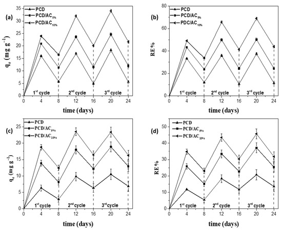 Three cycles of adsorption/desorption have been performed using ca. 0.1 g of each adsorbent in 10 mL of 500 ppm solution of IMD and CYM, respectively. The results are shown in Figure 8. In general, it can be noticed a slightly increase of the sorption capability along the three cycles of sorption/desorption for both pesticides. The average values of qe and RE% for IMD sorption onto PCD, PCD/AC5% and PCD/AC10% agree with the experimental values obtained by equilibrium analysis. That behavior is more pronounced for CYM where it can be also observed a decrease of the desorption rate for the three adsorbent materials. The same result is achieved with PCD/AC10% for IMD while PCD and PCD/AC5% reach the equilibrium at the first cycle both in sorption and desorption steps. Hence, it can be suggested that the presence of sorbate molecules plays a prominent role promoting the sorption process via cooperative mechanism due to sorbate-sorbate interaction. The results also suggest that the sorption mechanism occurs via dual physi- and chemisorption.